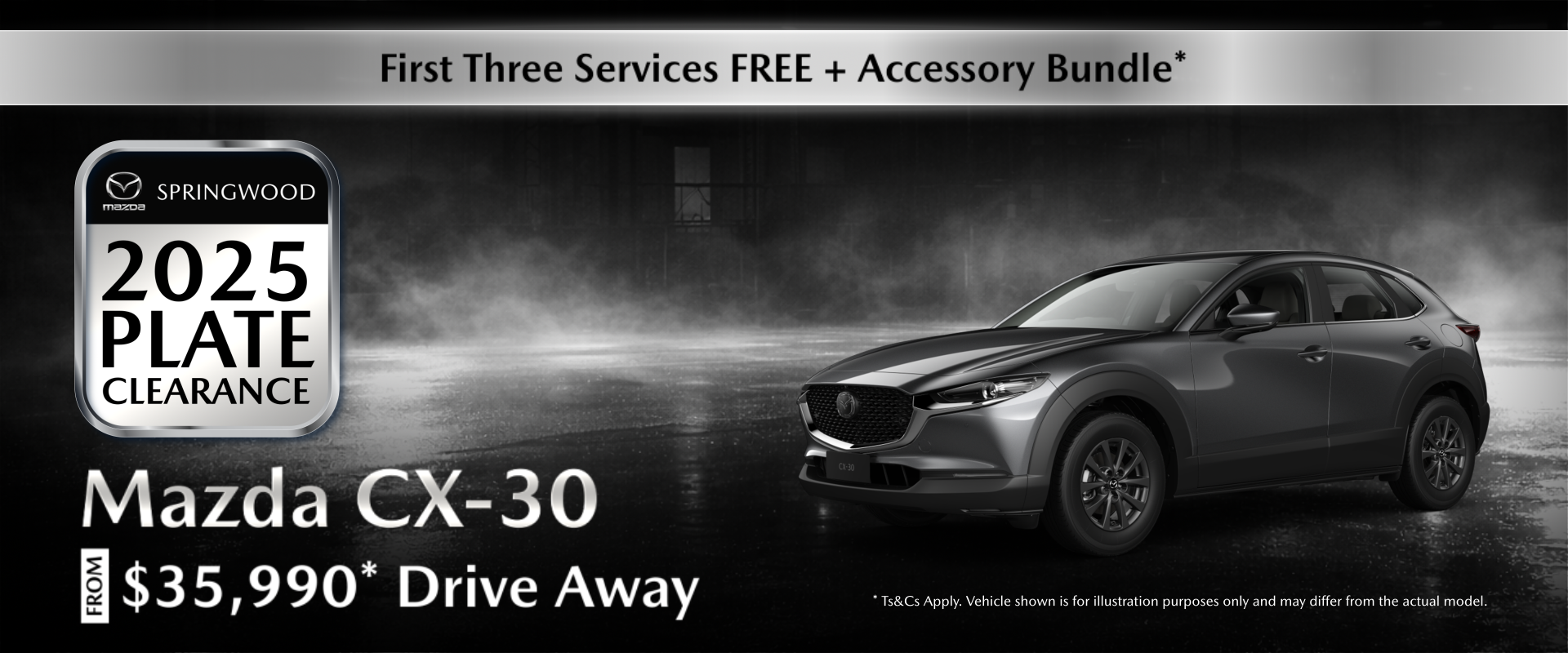 *Terms and conditions: The first three scheduled services are provided free of charge. The accessory bundle includes floor mats and headlight protectors. Vehicles must be delivered by 31/03/2026. Offer applies to in‑stock new vehicles only. Excludes demonstration vehicles, Used vehicles, hail‑affected vehicles, fleet purchases and ABN holders. Offer applies only to new Mazda vehicles CX‑3, CX‑30, CX‑5 (runout model) and BT‑50, purchased at the advertised driveaway price. Free services are valid only at Springwood Mazda Service Centre; services at other dealerships will not be accepted. There is no cash alternative and no redemption value.