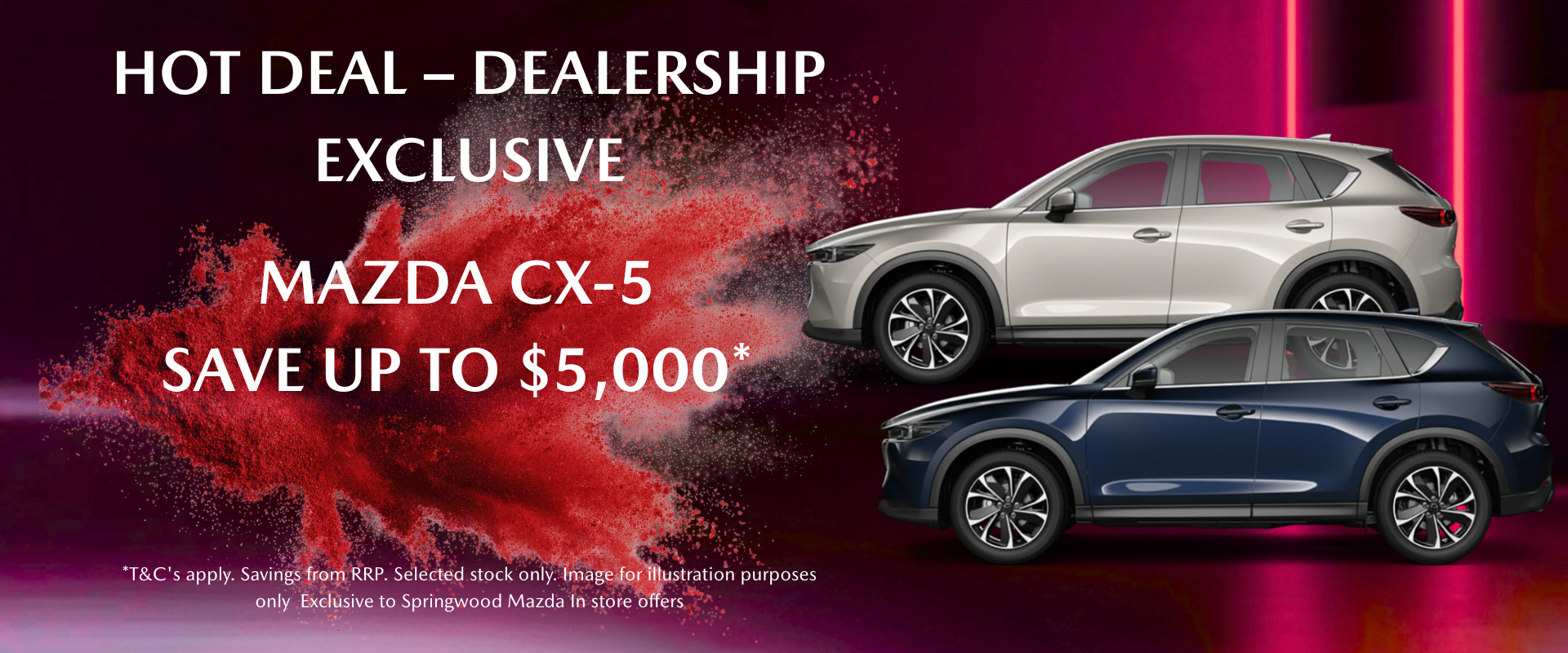 Step into our showroom for unbeatable in-store only offers on our in-stock Mazda range. At Springwood Mazda, we're delivering exclusive in-store Mazda deals you won't find elsewhere in Brisbane — with driveaway pricing that includes on-roads, immediate delivery, and the full peace of mind from 5YR Premium Roadside Assistance plus 5YR Unlimited KM Warranty.
